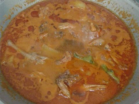 - Jika sudah agak meletup2 baru masukkan kentang yg sudah digoreng, sama ayam yg sudah direbus dan di geprek.