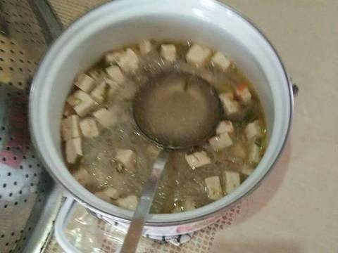 - Didihkan air dipanci, masukkan bumbu halus, kemudian masukkan tahu, masak hingga mendidih..